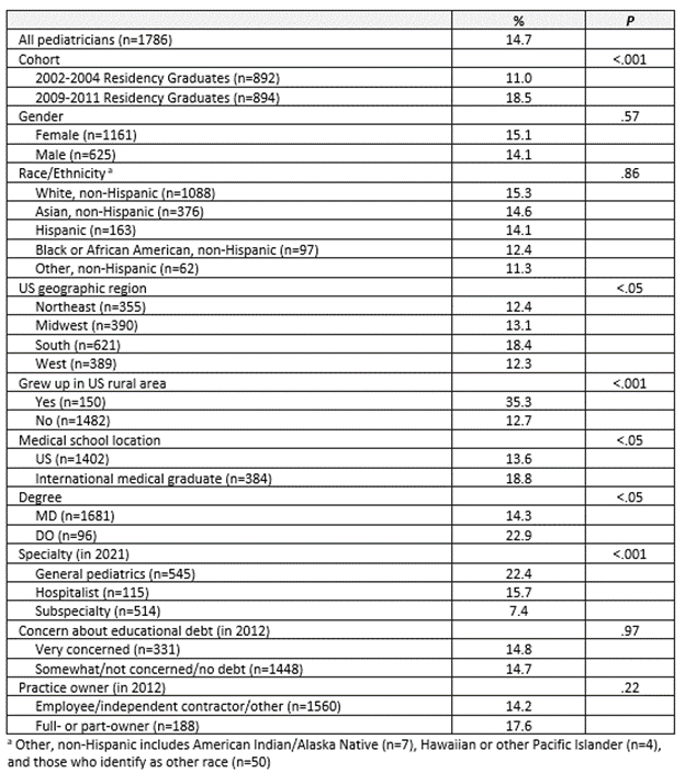 Table 1. Percentage of early- and mid-career pediatricians who reported ever working in a rural area (between 2012 and 2021) by demographic and work characteristics